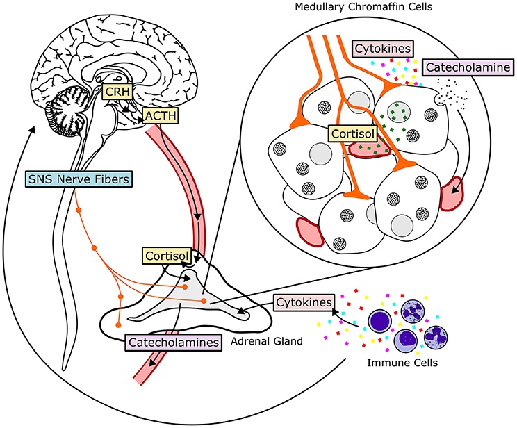 The sympathetic response in the nervous system, referred to as fight-flight, is a physiological reaction that occurs in response to a perceived harmful event, attack, or threat to our survival. It is activated through neuroception, meaning threats are detected by our nerves and neurosignals are transmitted to the amygdala in the brain, after which our innate defence mechanisms come online in the autonomic nervous system . This stress response is primarily mediated by (an on/off method) the secretion of these glucocorticoids through the hypothalamic-pituitary-adrenocortical (HPA) axis, as well as triggering the sympathetic-adrenomedullary axis (SAM) to release catecholamines through adrenergic neurotransmission. This all then circulates through the bloodstream and the brain.