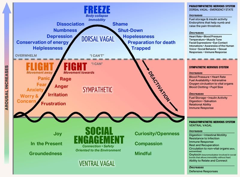 What he discovered in his studies was that trauma has to do with the third survival response to perceived life threat, which is freeze response. This is the top of the bell curve on the Polyvagal Chart, and is controlled by the dorsal vagal nerve and parasympathetic nervous system.
