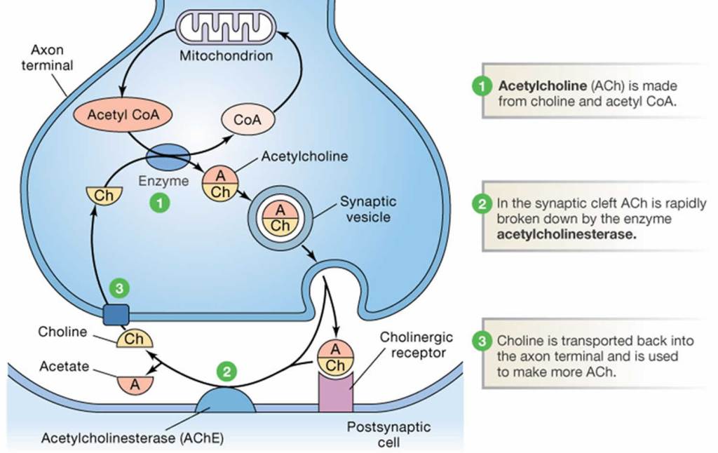9. Its activation leads to the release of acetylcholine (ACh) at the synaptic junction with secreting cells, intrinsic nervous fibers, and smooth muscles. Acetylcholine binds to nicotinic and muscarinic receptors and stimulates muscle contractions in the parasympathetic nervous system. Essentially, the neurotransmitter excites the muscle cells.