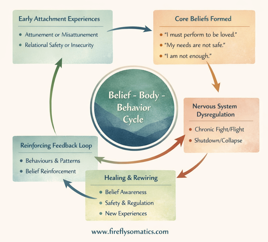 To understand this, we must move beyond the idea that beliefs are purely cognitive constructs. Core beliefs are not simply thoughts that can be replaced with affirmations. They are embodied predictions. They are neurobiological adaptations. They are relational conclusions encoded in circuitry, tissue, chemistry, and autonomic patterning. They are psychosomatic. They shape the body, the mind, and the lived experience of identity.