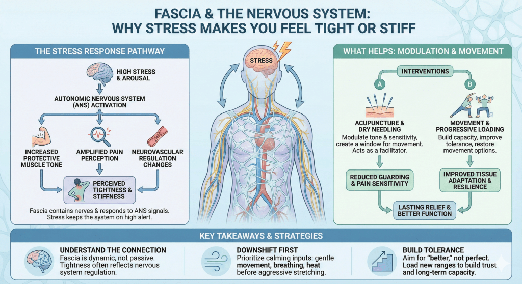Fascia is a continuous connective tissue network linking muscles, organs, and nerves throughout the body. It is densely innervated with mechanoreceptors and interoceptive fibres, making it highly responsive to autonomic tone and emotional states. Chronic stress can create fascial stiffness, restricted mobility, and altered proprioceptive signalling, contributing to persistent pain and tension (Schleip et al., 2012).