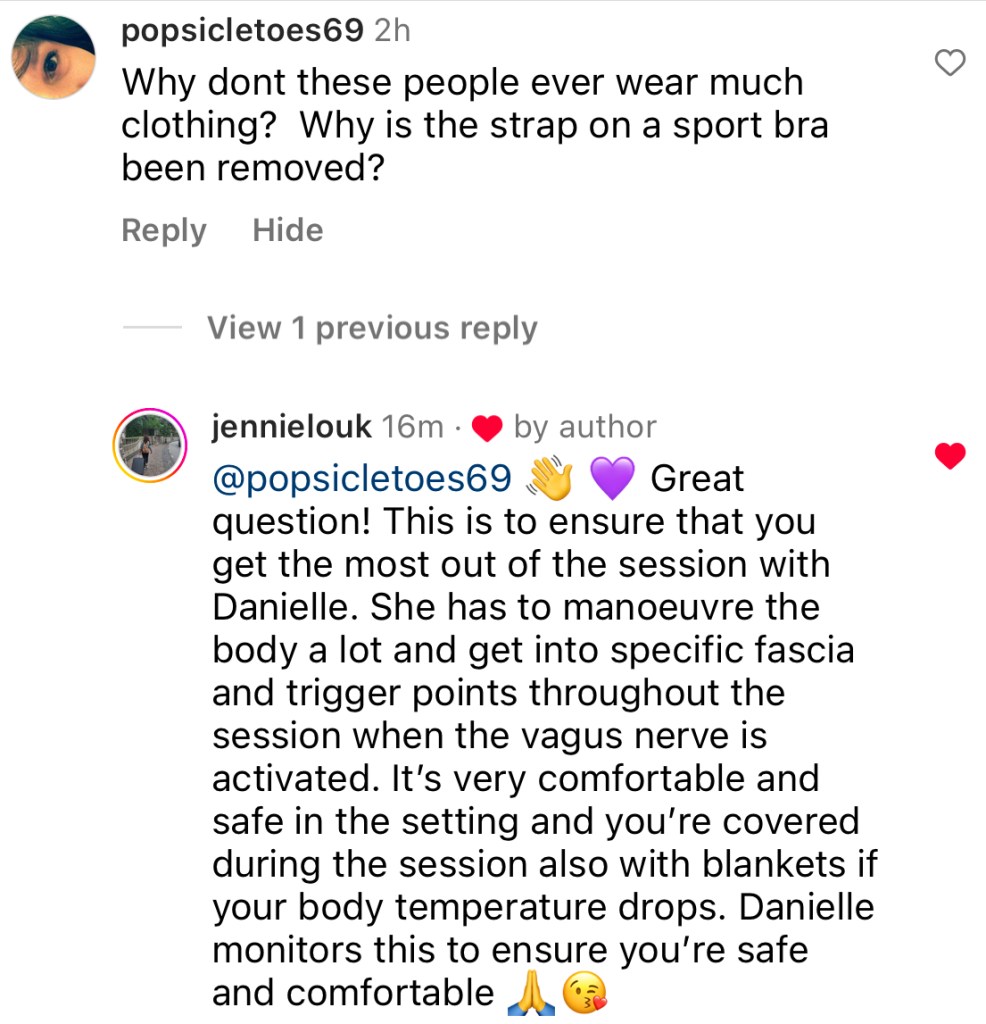 The session then progresses to full body works, which includes vagal activation, coherence techniques, musculoskeletal work such as fascial release, trigger point release, dynamic stretching, and much more. The duration of body work depends on your appointment type (Online or In person) and with whom is guiding you (Danielle or Coach Amy).