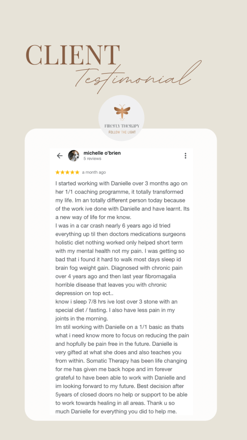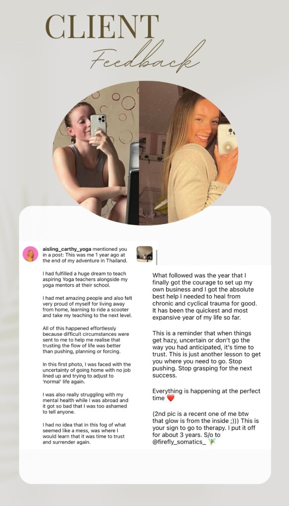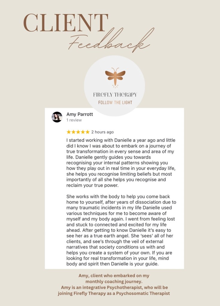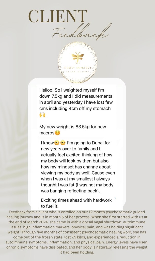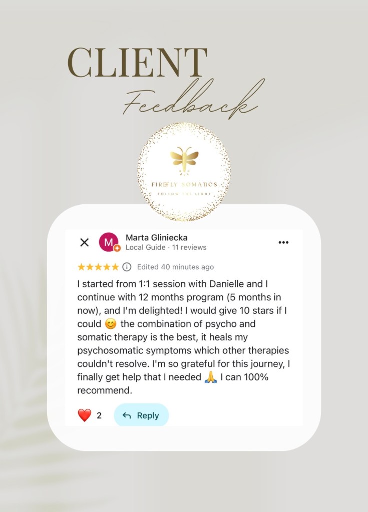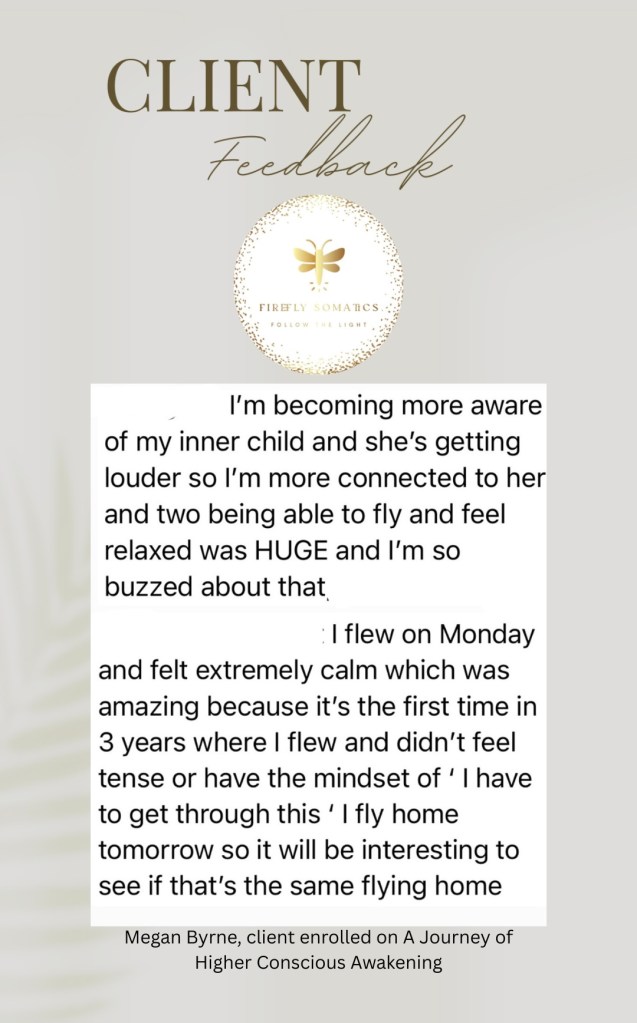 The following testimonials come directly from clients who have walked the full 12-month guided psychosomatic healing journey with Firefly Somatics™. Over the course of a year, they experienced the depth of The Firefly Method® — weaving together mind, body, and soul healing, nervous system regulation, energy realignment, and spiritual awakening. These written and video stories share the lived transformations that unfold when clients commit fully to this intimate, year-long programme. Their voices speak to the courage, breakthroughs, and lasting change that this journey makes possible.