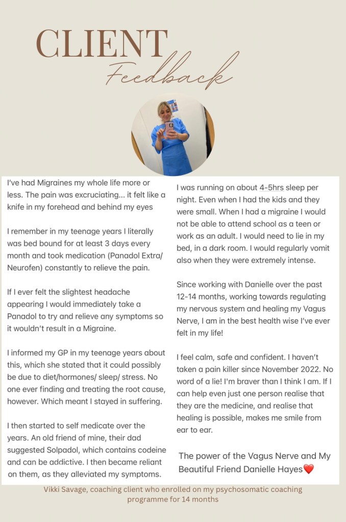 was the cause of her migraines. Vikki enrolled on the coaching journey with Danielle for 15 months, and